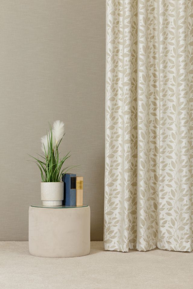 Leveles inda mintával díszített elegáns jaquard. Lágy esésű, viszkóztartalmú szatén függöny. Maximális magasság 295 cm.